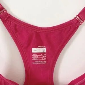 Nike pink racerback tank top with adjustable straps. Color is more of a bright, vibrant pink than picture shows. Seamless, FitDri stretchy woven fabric. Build in shelf bra. Size is small (4/6)