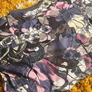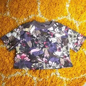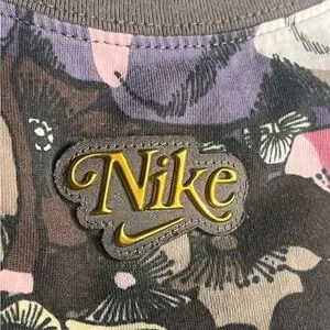 Vibrant Nike tee with floral and mushroom design. Features purple and pink hues. Comfortable and stylish for everyday wear.