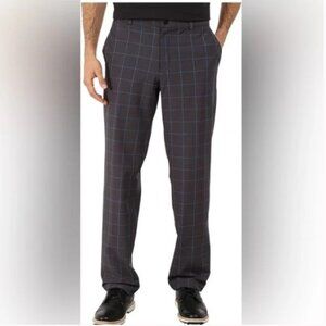 This pair is a men's Size 38x32 and features a modern, subtle plaid pattern in a versatile blue-grey color. The pants are made with Nike's FitDry technology, a moisture-wicking fabric that helps keep you cool and dry through all 18 holes. They have a flat-front design, belt loops, and a classic four-pocket layout (two front, two back).