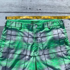Elevate your golf game and casual wear with the Nike Golf Tour Performance Shorts. Designed for the active man, these shorts feature a stylish green and grey plaid pattern that seamlessly blends sophistication with the great outdoors. The size 32 waist with a 12-inch inseam ensures a comfortable fit for a variety of body types, while the mid-rise cut offers a classic look for any occasion. Crafted from a blend of polyester and spandex, these shorts are engineered with Nike's Dri-Fit technology to keep you cool and dry. Lightweight and stretchy, they allow for unrestricted movement on the course or during casual activities. Pockets are practical, and the flat front design keeps the focus on the timeless plaid design and the subtle Nike Golf accents that exude a preppy yet sporty vibe.