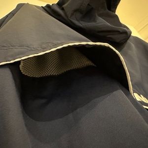Details: This jacket has a hood with pull tabs, a large zippered pocket in the front and pull tabs for tightening at the bottom. It is vented in the back to let in air. This jacket is unisex.