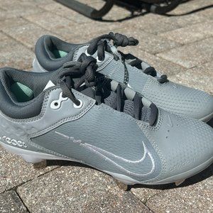 A new pair of Women’s size 7 Nike Hyperdiamond 4 Elite Softball Cleats without the box. The color pattern is grey and white. Model CZ5917-012.