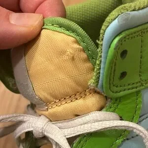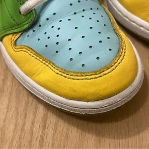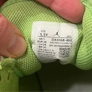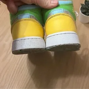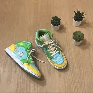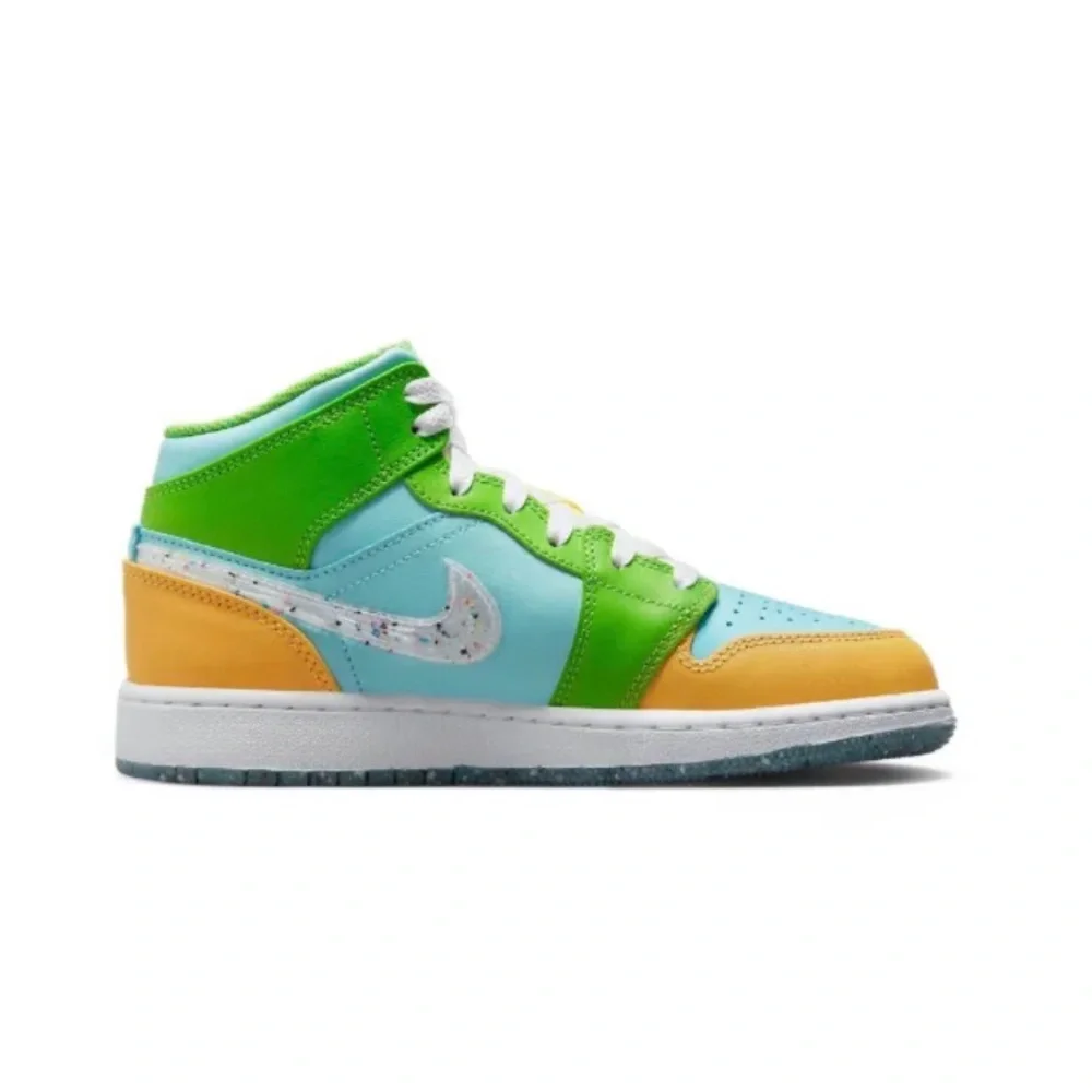 Nike Jordan Air Jordan 1 Mid SE "Recycled Grind" grade-school sneakers in the Glacier Ice, Citron, and Green colorway. Good condition / used condition. Flaws noted in the pictures - wear to the back heels, stain at the top inside of 1 shoe, scuff along the front toe of 1 shoe.