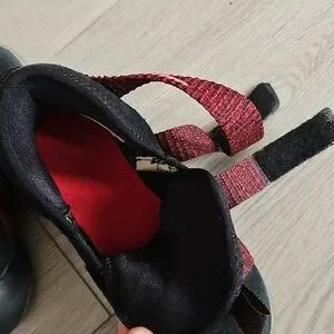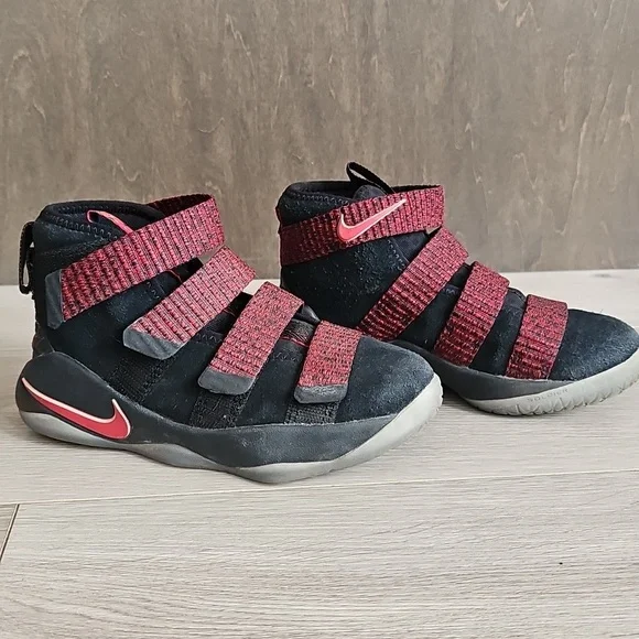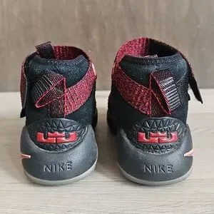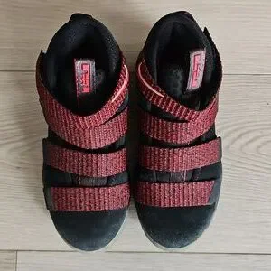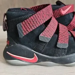 Nike Lebron Soldier 11 Sneakers. black shoes with heathered red velcro straps.