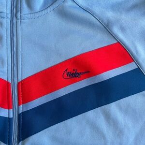 Light blue jacket with striking red and navy chevron design. Features a high collar and zip closure. Ideal for casual wear.