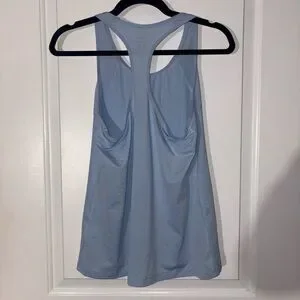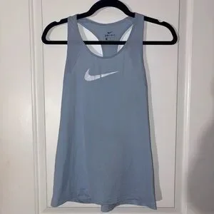 Nike Dri-FIT tank in light blue. Breathable, quick-drying fabric for workouts. Racerback cut allows full range of motion. White Nike Swoosh on front for a sporty look.