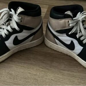 Nike sneakers featuring a sleek black and white design. Durable tan soles for added traction.