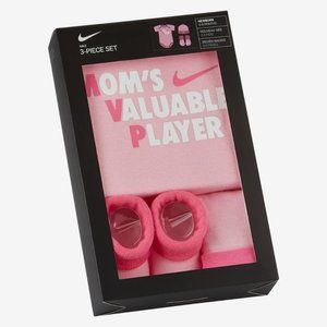 The Nike Set features a short-sleeve bodysuit, hat and booties each made from soft knit fabric with matching designs for coordinated comfort.