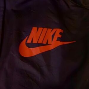 Nike jacket with bold orange and brown design. Drawstring hood, zip pockets and air vent in back. Lined. Women's size small.