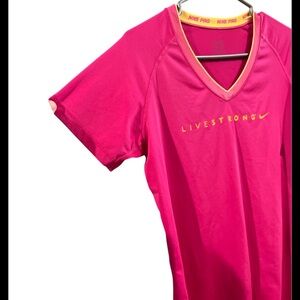 Get ready to stand out at the gym or on the track with this Nike Pro Livestrong Workout Shirt! This bright pink and neon yellow short-sleeve shirt is designed for performance and style, making it a must-have for your activewear collection.