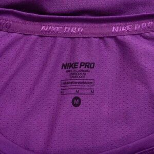 Stay cool and comfortable during your workout with this Nike Pro Dri-Fit athletic top! The top is made of a moisture-wicking fabric that helps keep you dry and comfortable during intense exercise. The top features a purple color with Nike logo on the front. The top has short sleeves and a slim fit design that makes it perfect for layering or wearing on its own. This top is perfect for runners, athletes, fitness enthusiasts or anyone who is looking for a comfortable and durable top to wear during their workouts.
