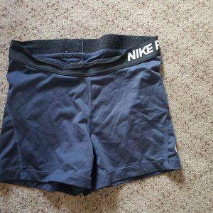 Nike pro shorts, navy blue with black band, and white lettering and swoosh