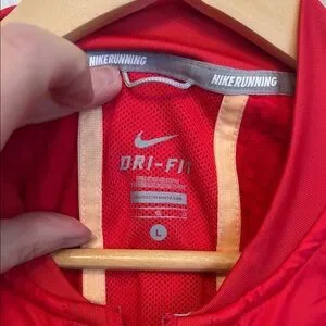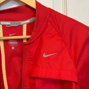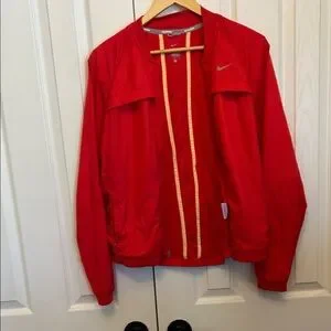 Vibrant red jacket with Dri-Fit technology. Nike logo on interior. Ideal for running.