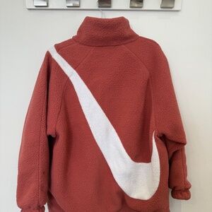 Nike reversible teddy coat. Fuzzie on the one side, and satin like shine on the other side. Warm and cozy jacket for the fall or spring. Pink colour with white nike stripe. Women's small, fits oversized. Very good condition no signs of wear.