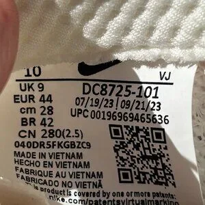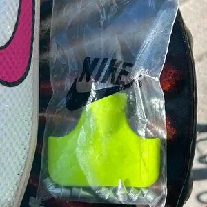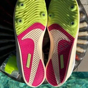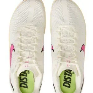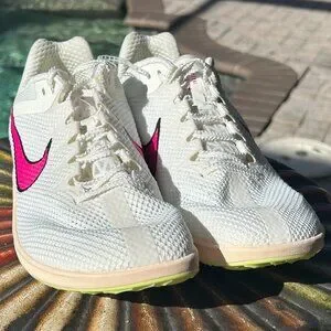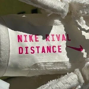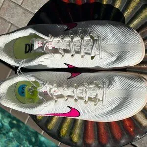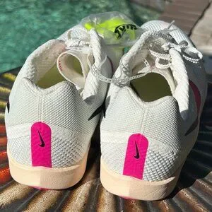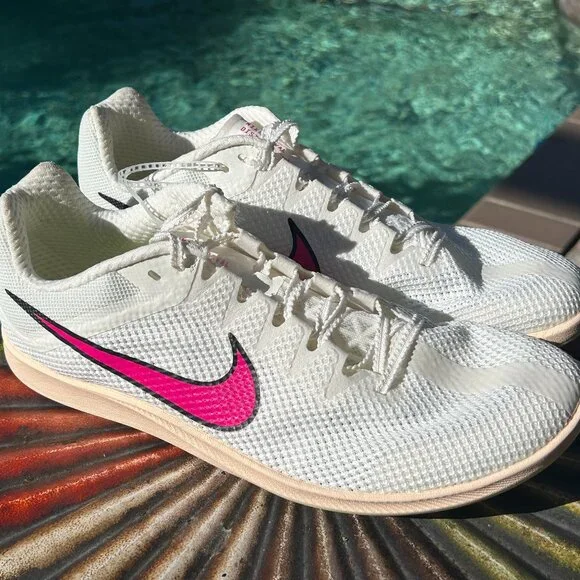 A new pair of Nike Rival Multi Distance Spikes without a box. They include a full set of spikes and a Nike wrench. The color pattern is sail/pink which is a cream (“sail”) upper; light orange sole and a pink swoosh. Model DC8725-101. Size is Men’s 10 (these are considered unisex so would be women’s 11.5 also). Nike and other sites say that these shoes run about a half size small. So if you are typically a men’s size 9.5 then the 10 in this shoe would be Nike’s recommendation to you.