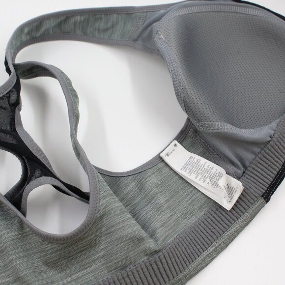 Women's medium. High support sports bra with padding. Zip-up front with hook closure on inside. Grey and black. For high intensity exercise. In good condition.