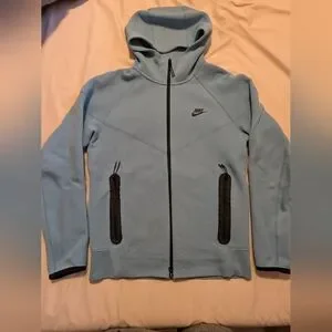 Light blue Nike hoodie with black zipper details. Features a sleek design and iconic logo.