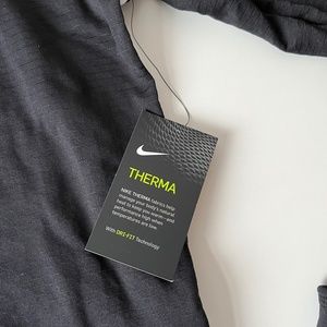 Features a round neckline and long sleeves. Therma fabric to manage natural body heat and keep you warm. Performs well in low temperatures. Dri-Fit sweat wicking technology. Hand cuffs to fold over and use as mittens in cold weather. Draw string cinch at waist. Cutout keyhole at back near waist.