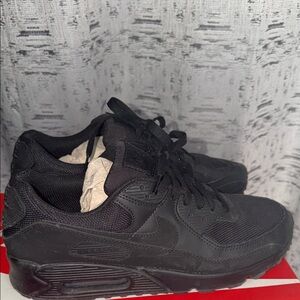 All-black Nike sneakers with mesh detailing. Lightweight and versatile. Ideal for casual outings.