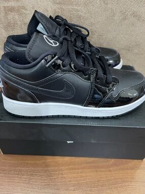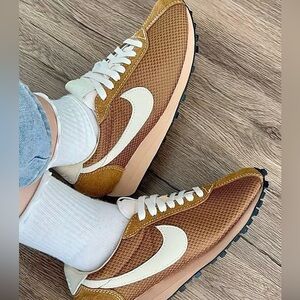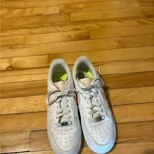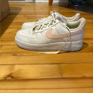 Low-top Nike sneakers with leather upper. Light pink Swoosh and heel accents. Lace-up design with cushioned sole. Clean, simple style for everyday wear.