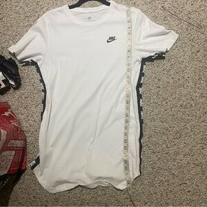 Picturing a white cotton short sleeve shirt with logo striping down the sides by Nike in a men’s size small.