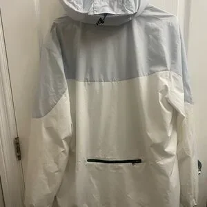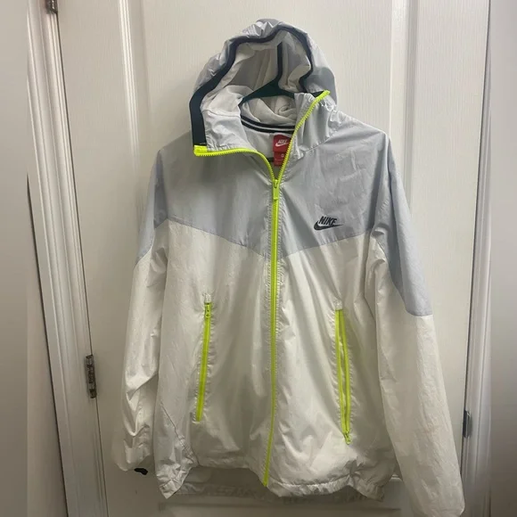 Nike jacket in light weight material. White with neon yellow zipper detail. Sizing is men’s but this can be worn as female. It is a men’s medium, roughly equivalent to female large. Good condition but has a two faint stains shown in last photos (no attempts have been made to stain remove).