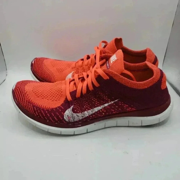 Stylish Nike athletic shoes for women. Vibrant red and orange design. Comfortable and lightweight. Perfect for running and training.