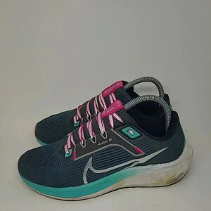 Nike athletic shoes for women. Features teal mesh upper with pink accents. White sole for comfort and support. Excellent cushioning. Perfect for running and training.