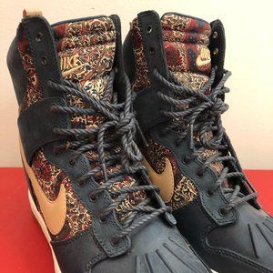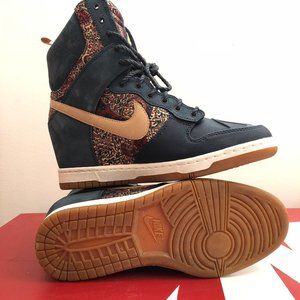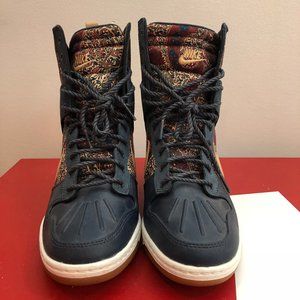 Stylish high-top sneakers with a navy base and tan accents. Features a unique patterned design.