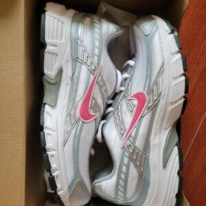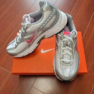 The Nike Women's Initiator in Silver/Red is a retro-style running shoe featuring a breathable mesh upper, cushioned midsole, and durable rubber outsole for everyday comfort and support.