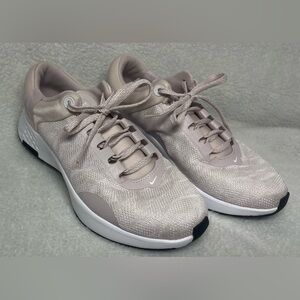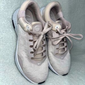 Stylish Nike women's sneakers. Light pink upper with white accents. Comfortable and trendy design.