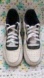 a pair of Nike Air Force 1 sneakers with a white leather upper, black lining.