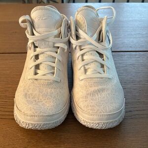 The Nike Zoom LeBron NXXT Gen White Metallic Silver comes in a white and metallic silver colorway with black accents.