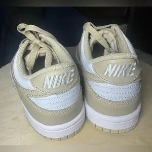 Classic Nike low-top sneakers. White panels with beige overlays and laces. Crisp Swoosh on the side. Sporty and versatile style.