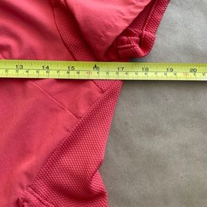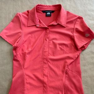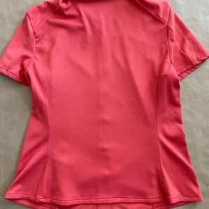 Nike coral colour short sleeve shirt. Unique snap front closure. Has one zippered pocket in the front. Nike logo on the sleeve.