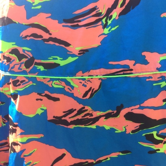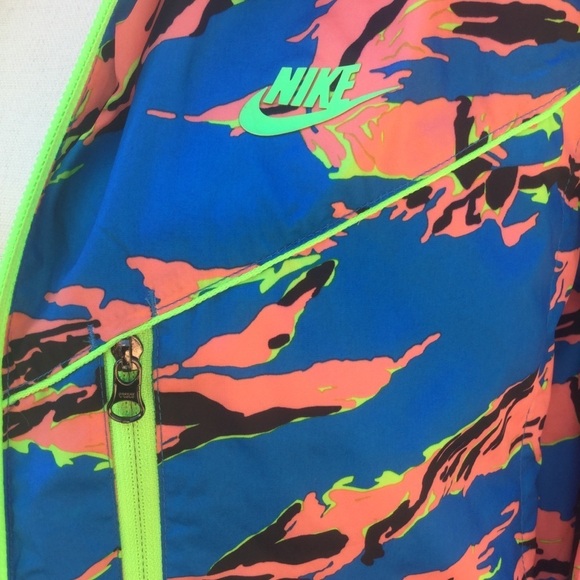 Amazing pattern, salmon, blue and neon green, styling! Immaculate condition, zipper front, tie/cinch bottom, hood and zip breast pocket. 100% polyester. Drawstring hem, fold and pack in your pocket! Similar wind breaker posted on Nike website for $195.