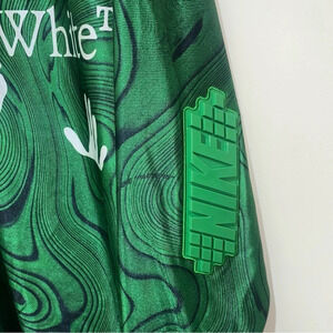 Nike x Off-White mens Kelley green Long sleeve all over print jersey. Rubber like Nike details on the elbows. Size and material tag have been cut out. This does make it more difficult to authenticate, but all of the markings on the real jersey is also on this one. This has not been authenticated but I believe it is real. There are 2 small picks in the fabric on the front as noted in the photos. I am guessing based on measurements this would fit a size XXL. Check measurements for best size reference. Feel free to send offers.