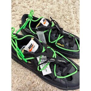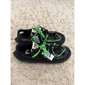 These sneakers feature a unique deconstructed look with cutout details, neon green secondary laces, and signature Off-White branding elements.