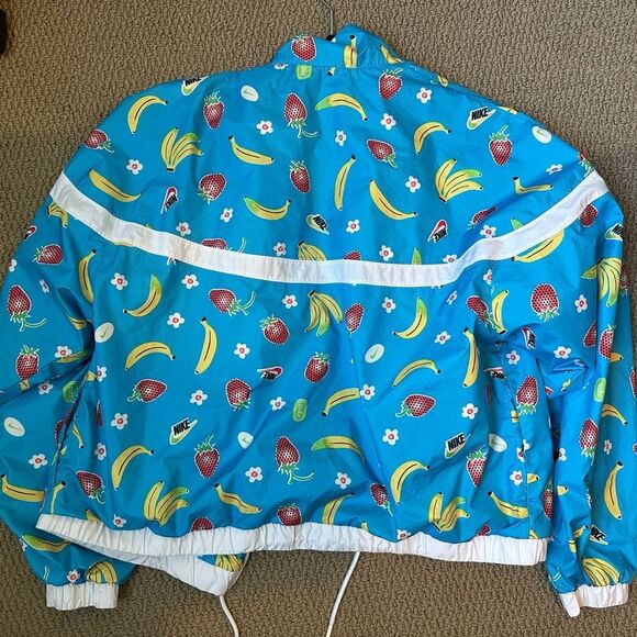 Vibrant jacket with a playful fruit print. Features bananas, strawberries, and more on a bright blue background. Perfect for adding a fun touch to any outfit.