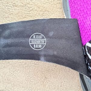 -bold purple upper, gray mid foot velcro strap with prominent Nike Swoosh