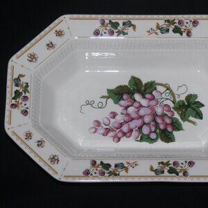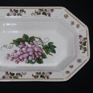 Nikko's Orchard features a central image of grapes on a vine with leaves. The inside rim is ribbed, while the outer rim features berries, blossoms, and leaves. The bowl is in pristine condition and appears unused as there are no utensil scratches or signs of dishwasher usage. Glaze is smooth and the colors are still bold and vibrant. There are no chips or cracks.