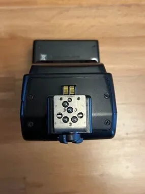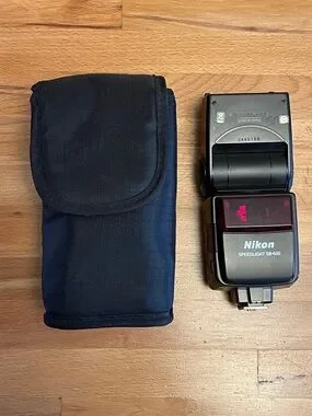 Compact Nikon on-camera flash. Clear primary flash window and red front sensor panel. Shoe-mount connection for DSLR use. Simple, functional controls for quick shooting.