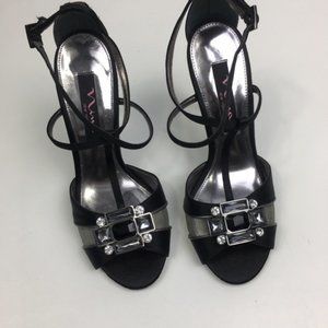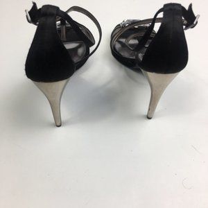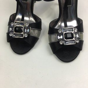 Nina Black/Silver Satin Jewel Heel Peep-Toe Pumps