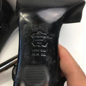 In great condition. Scuffs on silver part of heel. One light stain in front as shown in pictures. Inner and outer sole are almost like-new. Composition leather sole. Heel measures approx. 4'' Size 6