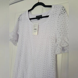 A pretty lace overlay give this women's Nina Leonard sheath dress a romantic look. In white.