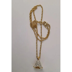 Nina Ricci Vintage Gold Plated Necklace with a dress shaped pendant addorned with approx 25 rhinestones and with the logo on the back.