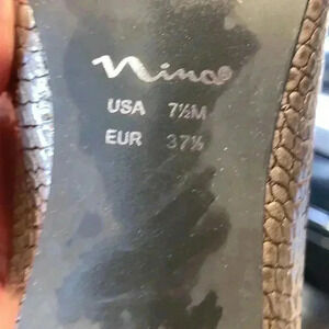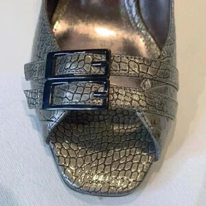 These attractive faux animal skin heels are perfect for a party or work. Buckles at the front add detail. Open toed with a three inch heel. Heels are in like new condition.