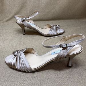 Gorgeous Nina New York evening sandals, these are in a beautiful neutral metallic tan colour with classic twist knot at the toe and reasonable 2” heel. Adjustable ankle strap.