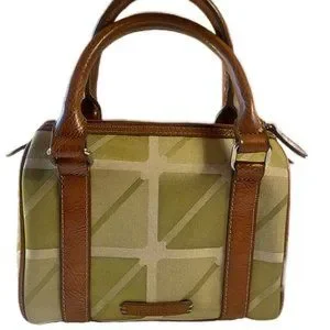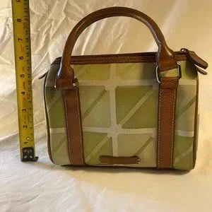 Nine & Co mini structured purse. Brown leather handles and accents, green square print. Great condition. Approximately 7.5 inches by 6 inches by 4 inches.