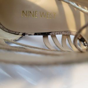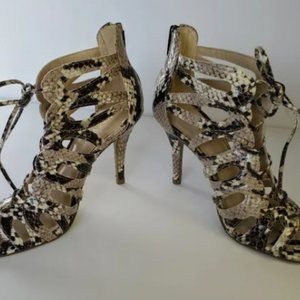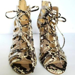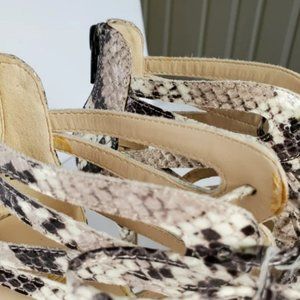 Snakeskin print gladiator sandals. They have a back zipper entry and lace up the front.